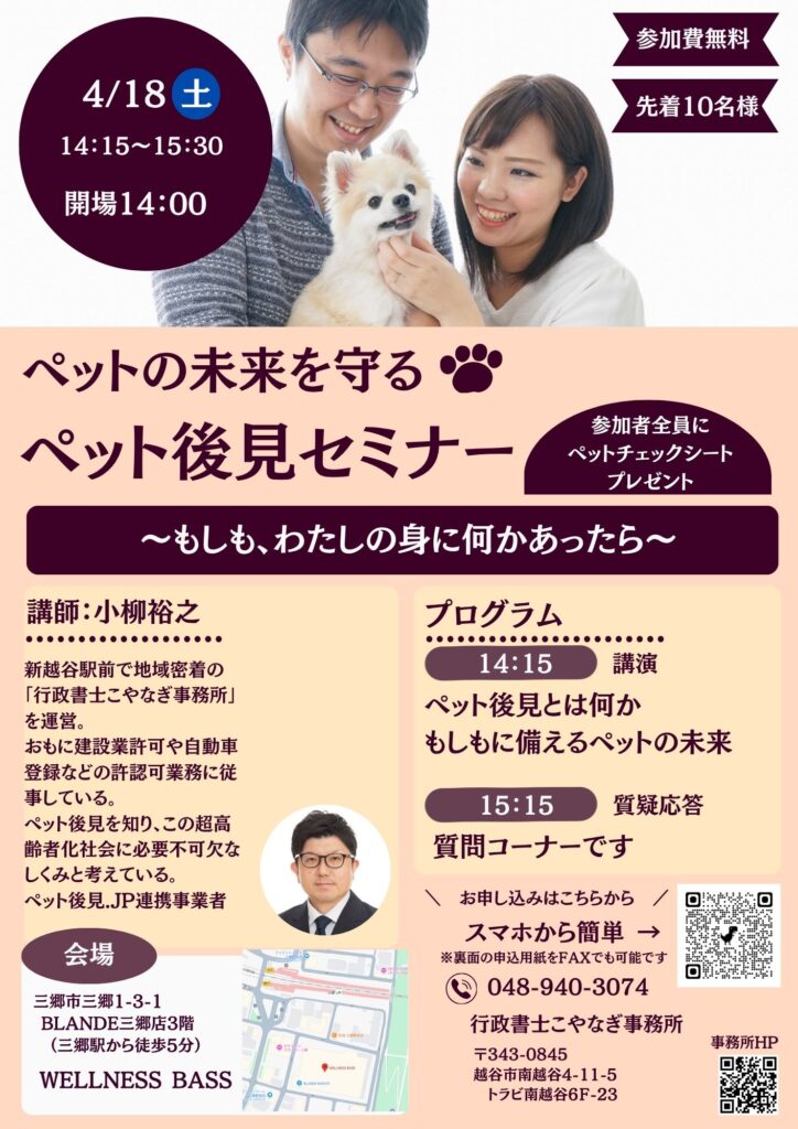 【埼玉県三郷市】4/18(土)開催決定!ペット後見セミナーのお知らせ