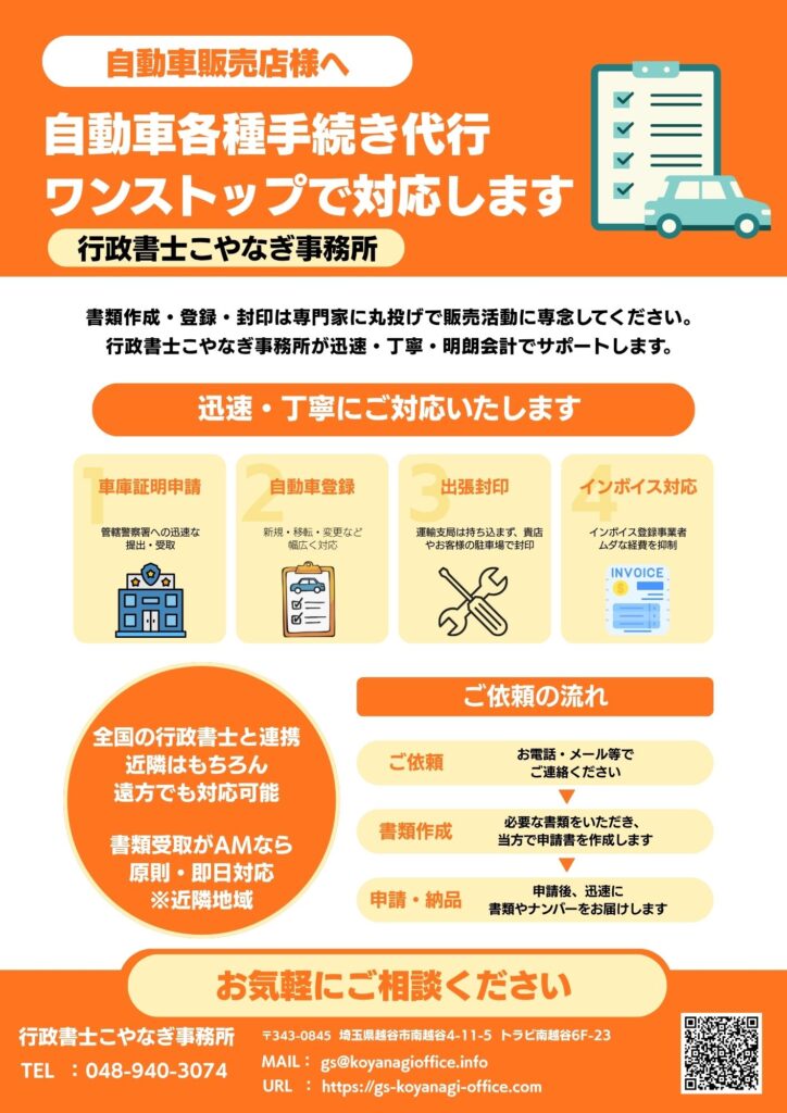自動車関連のお手続きは行政書士こやなぎ事務所にお任せください!